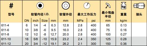 適用介質:石油基液壓油,水乙二醇,油水乳化液,油脂,潤滑油,原油,燃油,空氣和水。用于1.7MPa以上的空氣時,軟管需針刺。