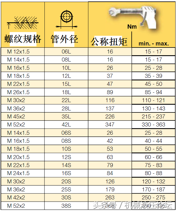 公制旋轉螺母接頭也分輕型和重型,輕型用L表示,重型用S表示。輕型和重型公制旋轉螺母的管接頭擰緊扭矩如下表: